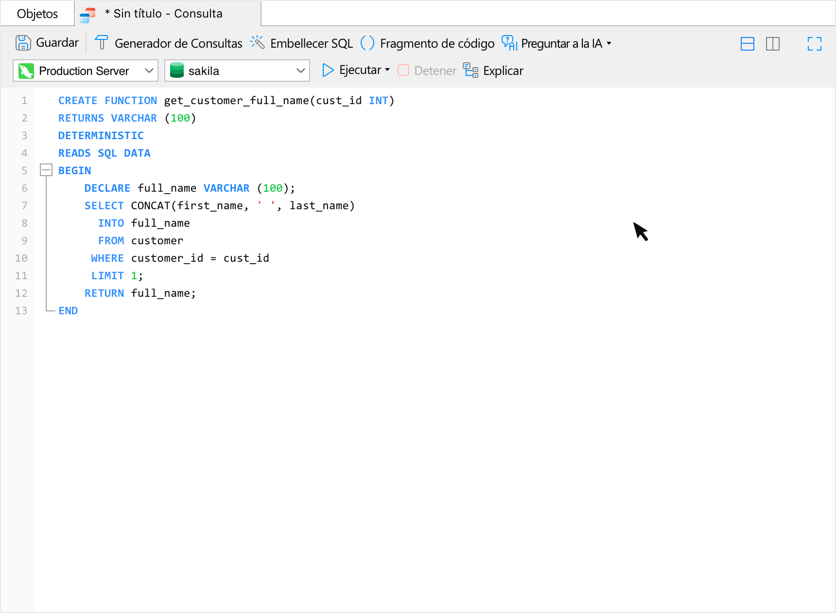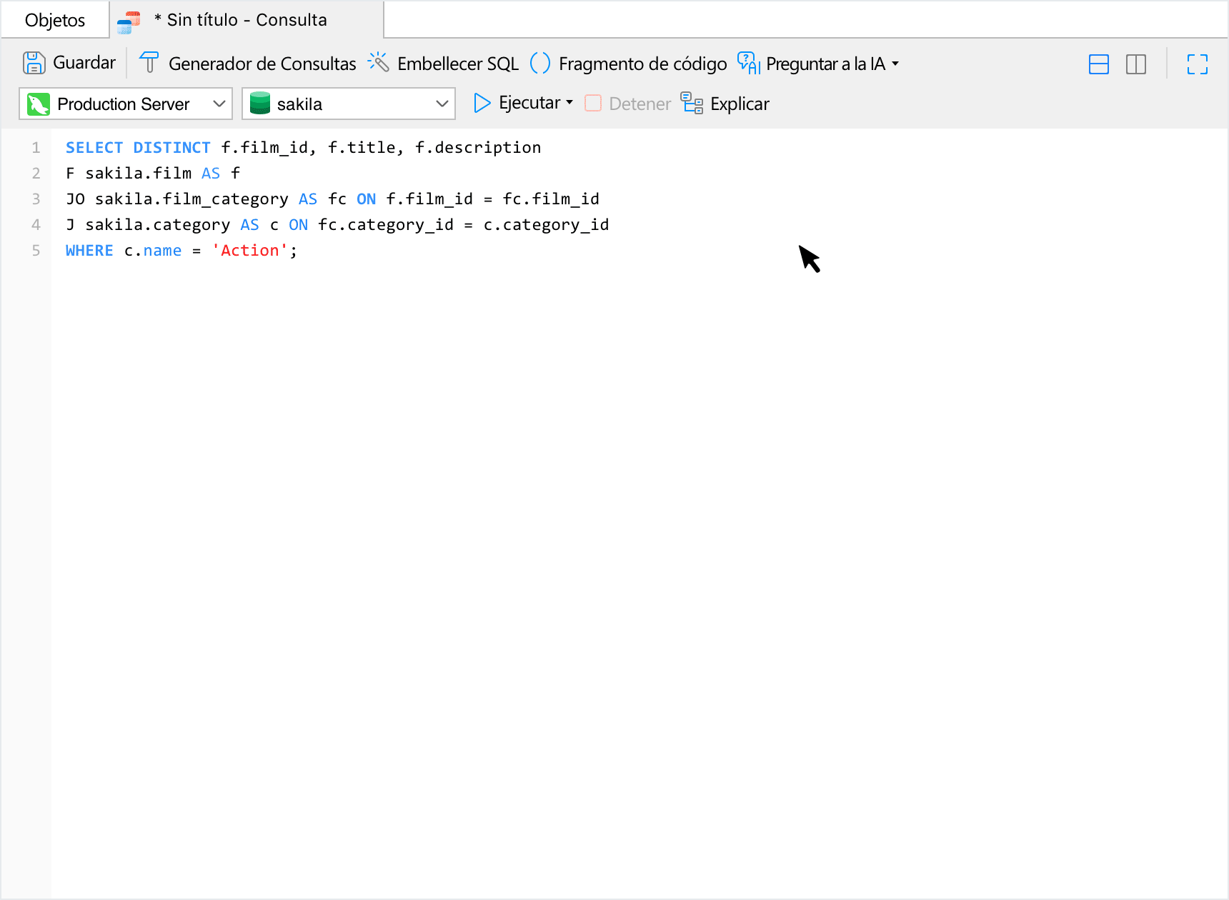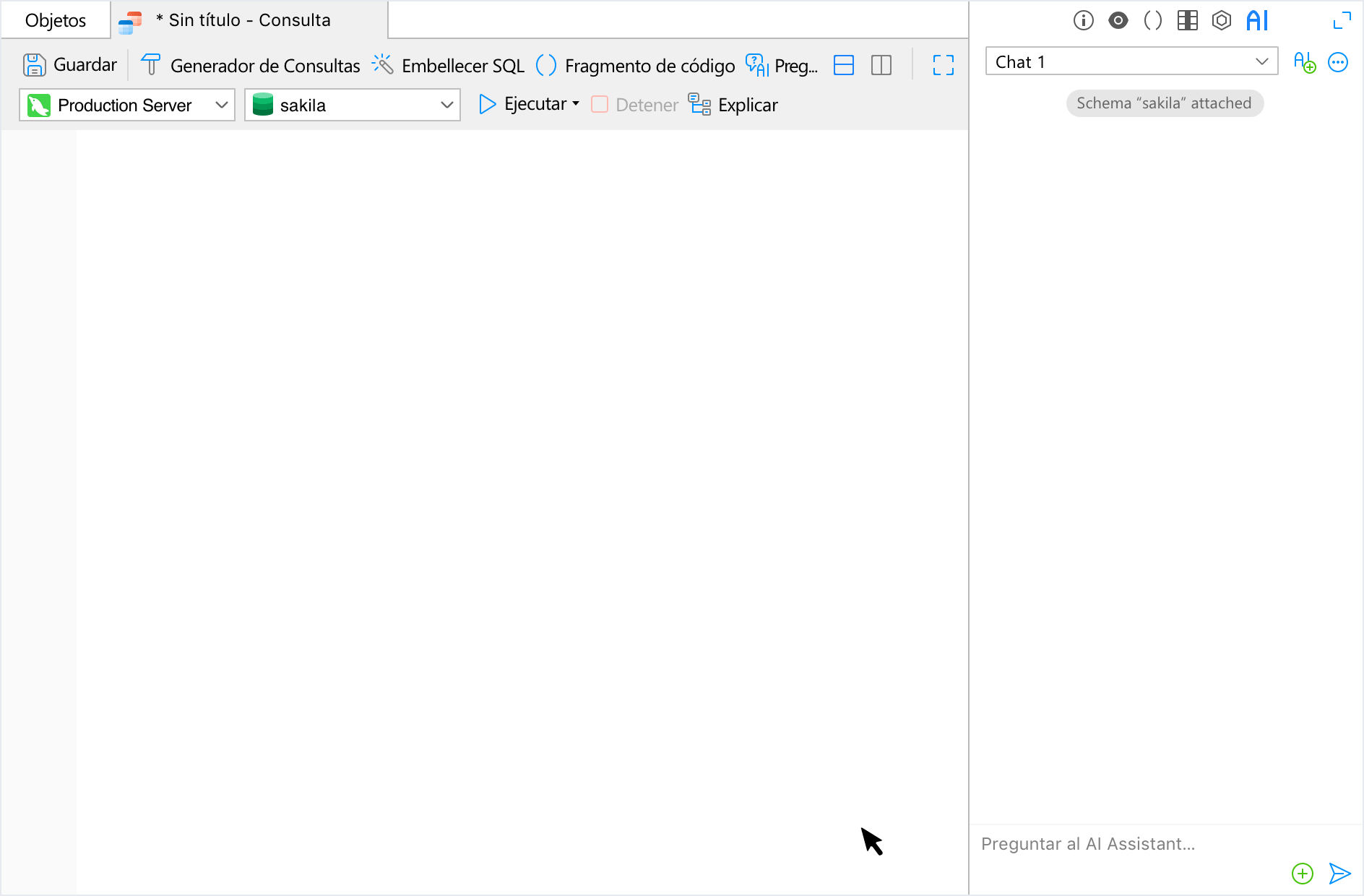 Consulta nuestra funcionalidad “Preguntar a la IA”, diseñada para agilizar el desarrollo de consultas SQL. Puedes personalizar y fijar tus acciones favoritas de IA, de forma que tus tareas más frecuentes estén siempre a un solo clic. Además, “Preguntar a la IA” incluye acciones integradas para explicar, optimizar, formatear y convertir consultas SQL entre diferentes bases de datos, haciendo que tus consultas funcionen en cualquier entorno. Te encantará la vista comparativa en paralelo, que permite visualizar fácilmente los cambios, y nada se aplica hasta que lo confirmas, lo que te asegura mantener siempre el control.