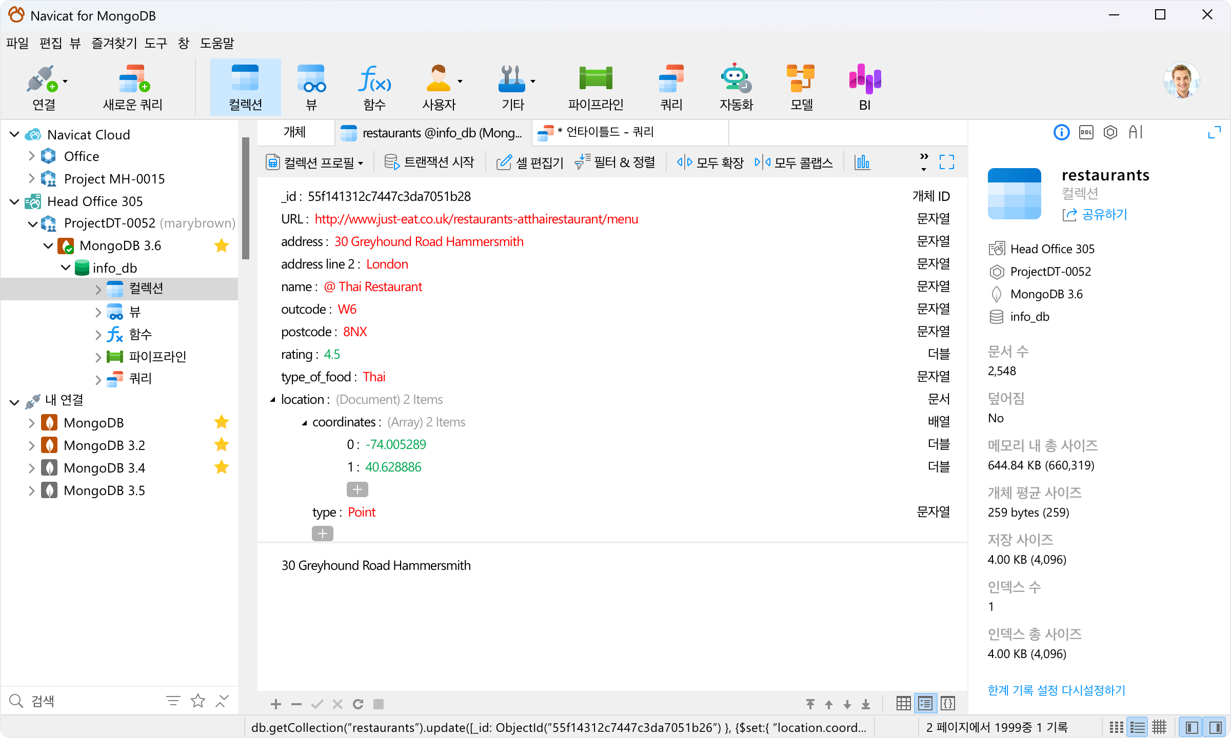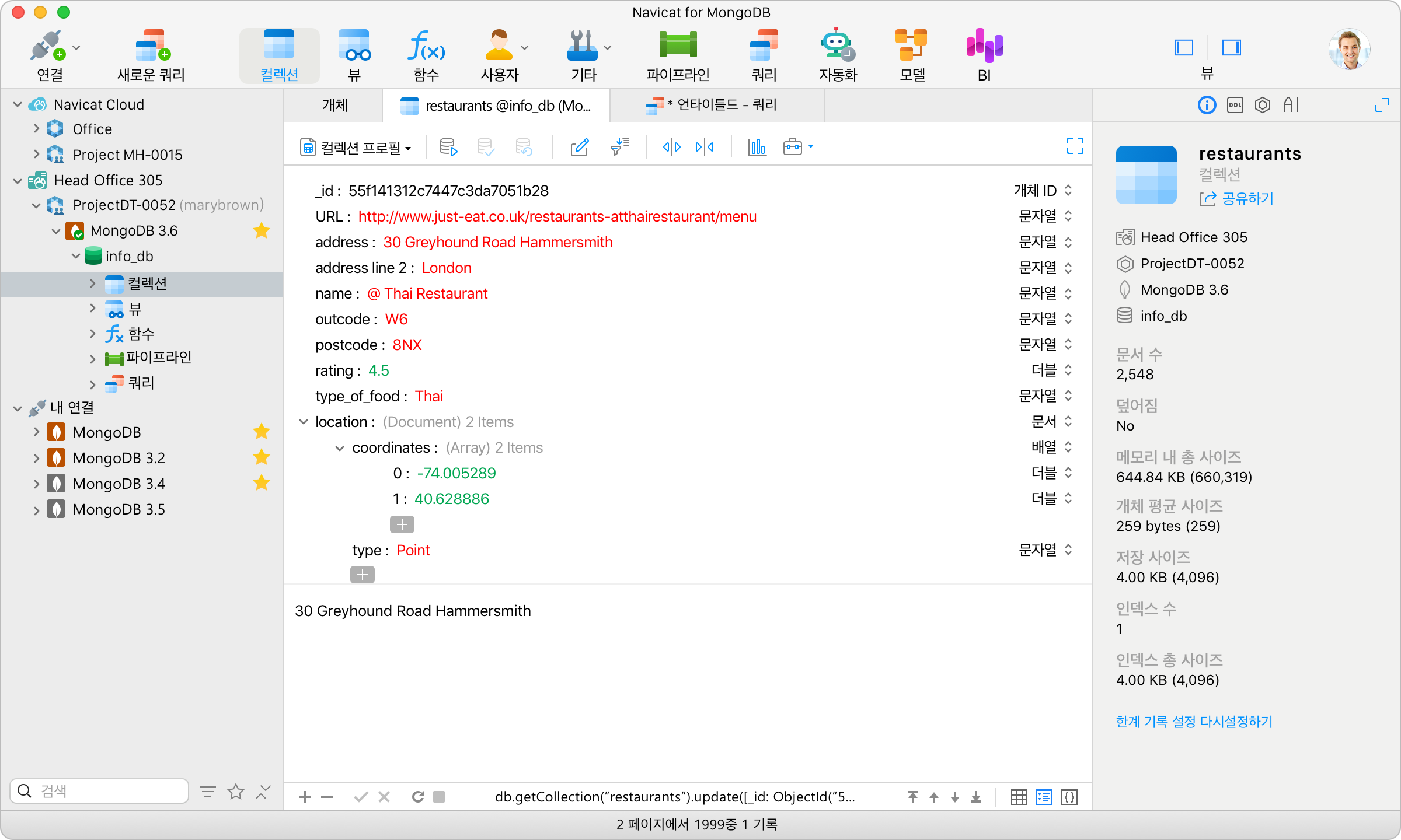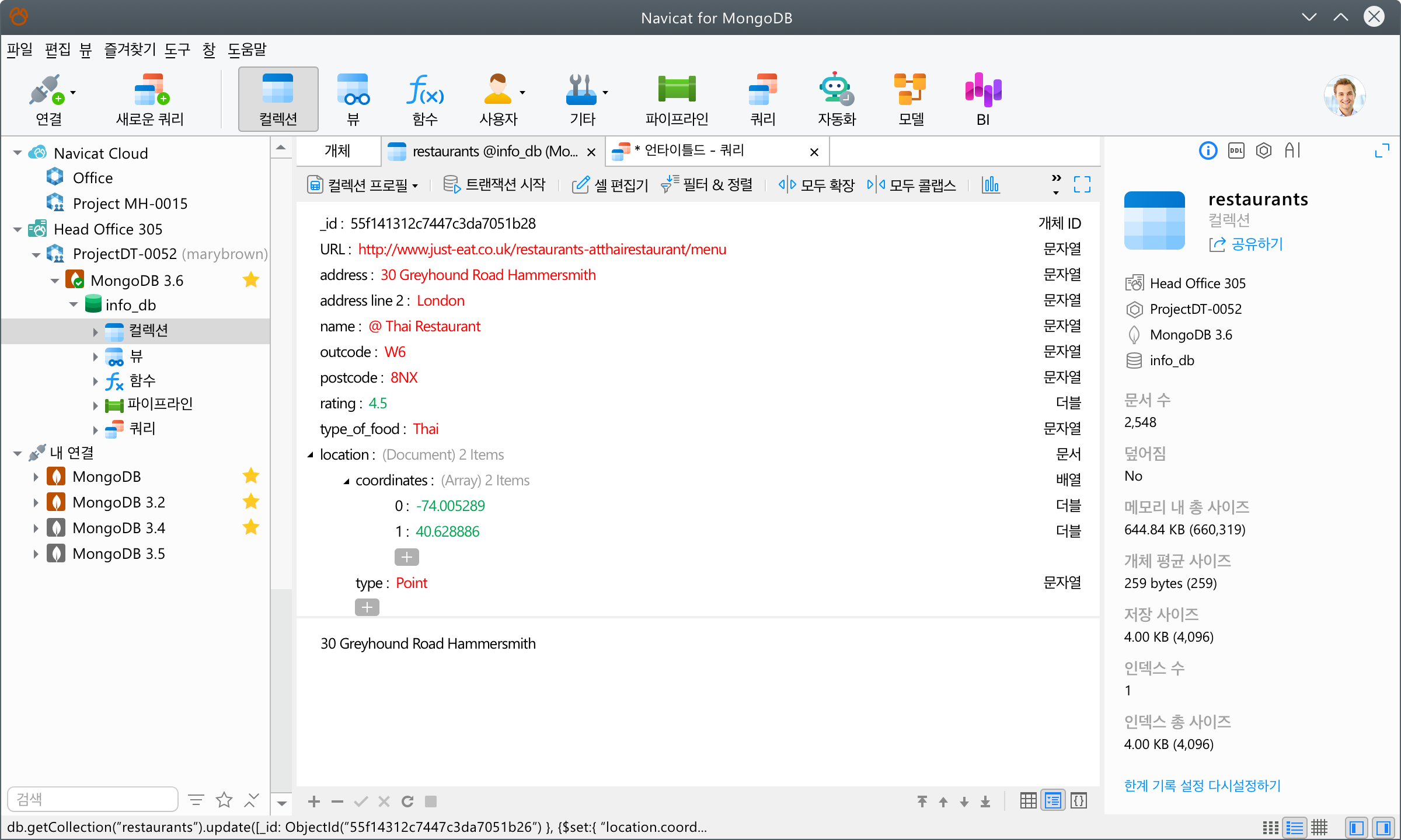 내장된 편집기를 통해 그리드 뷰, 트리 뷰 및 JSON 뷰에서 원활하게 기록를 보고, 업데이트하고, 삭제할 수 있습니다. MongoDB 4 전송 지원을 통해, Navicat이 여러분께 데이터를 효율적으로 관리하고 순조롭게 진해할 수 있는 도구를 제공해 드립니다.